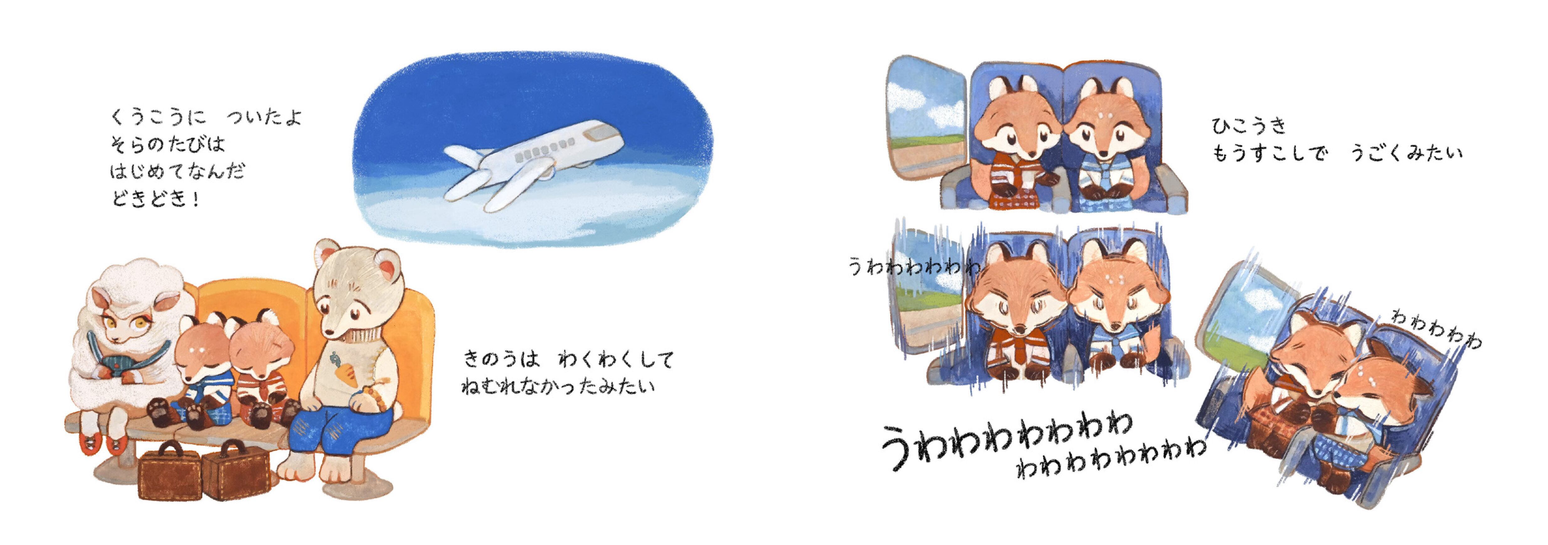 まろまゆとたれまゆは、森を出て「はじめてのたび」に出かけます。