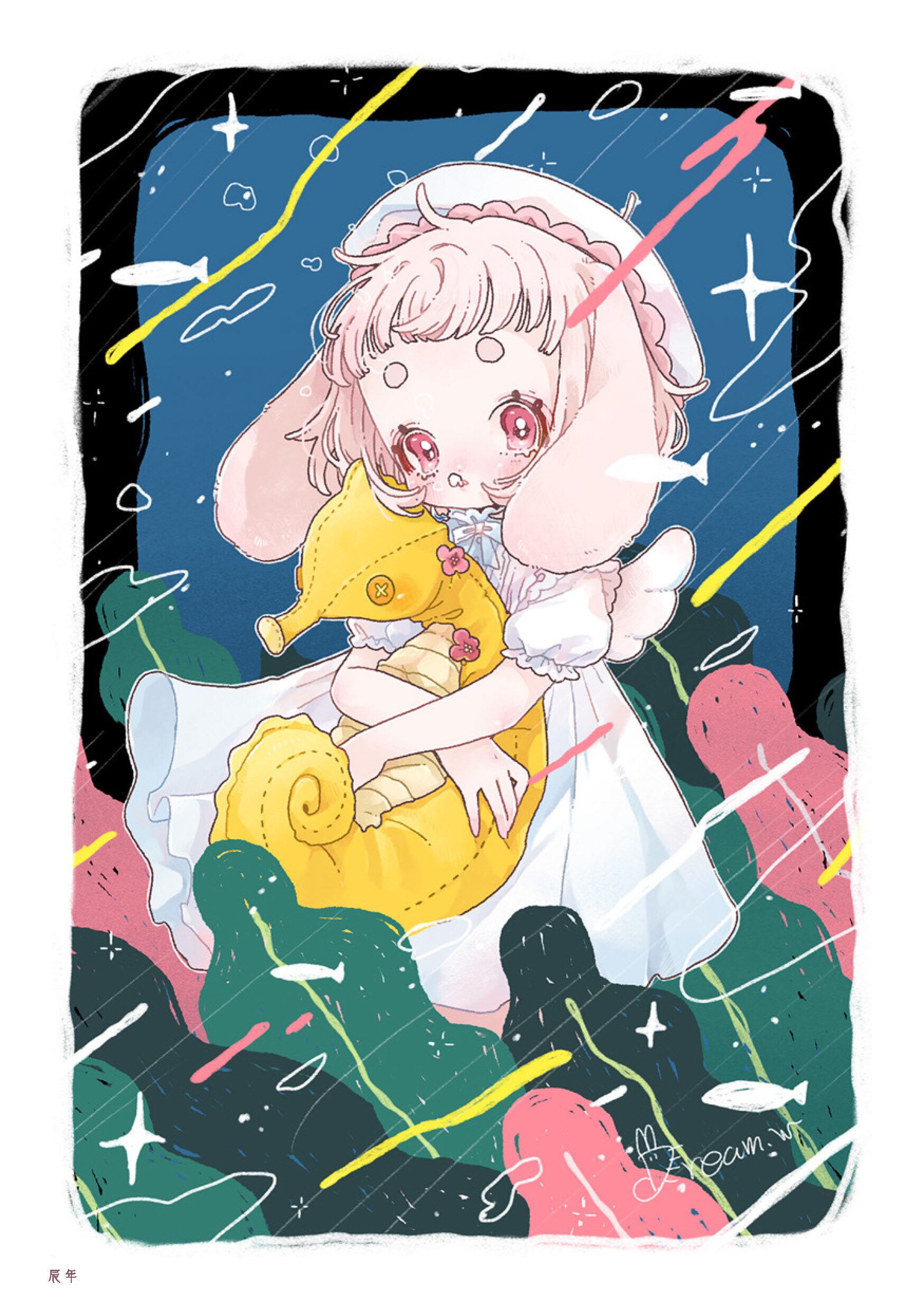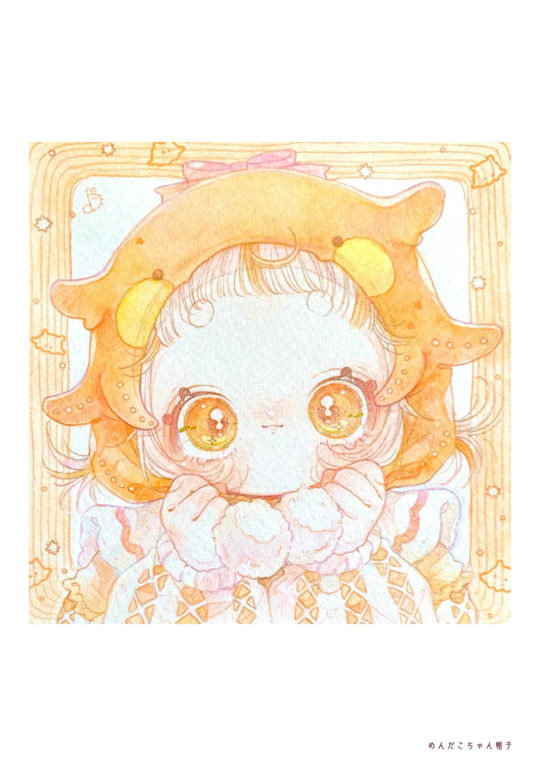 水彩色鉛筆をメインに使用し、食べ物や動物をモチーフとした親しみやすいふわふわした世界観の可愛い女の子を描いています。